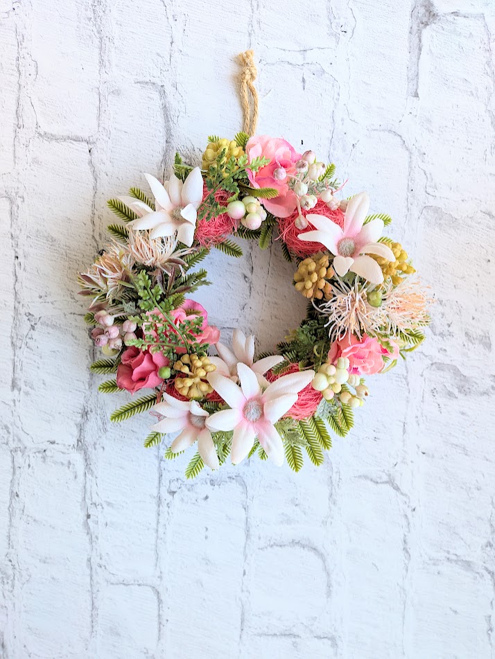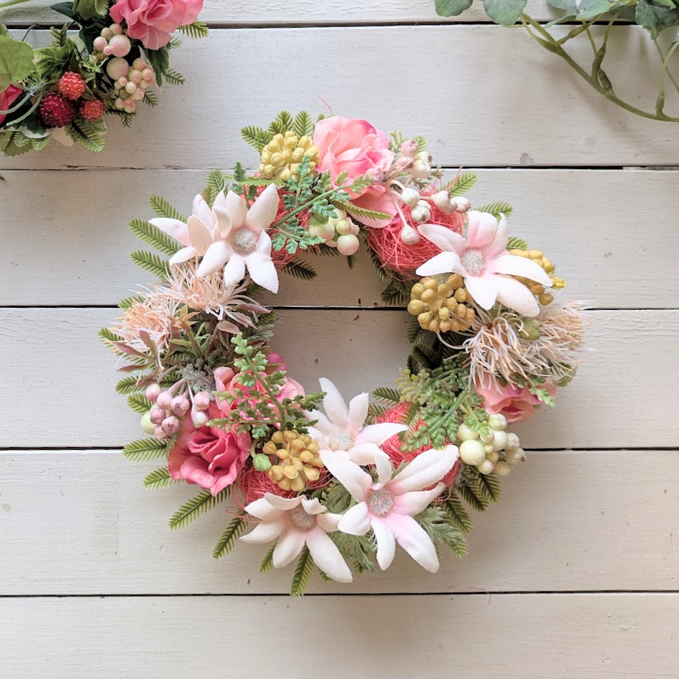 ホームアーティフィシャルフラワーフランネルフラワーとピンクローズのアーティフィシャルフラワーリースとミニリース(2点セット)
